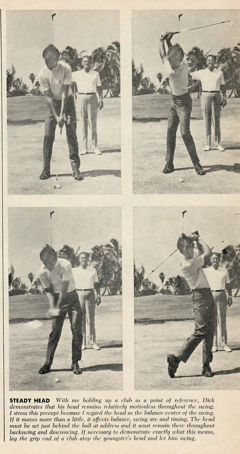 Dick’s older brother, John, had a fine golf swing when he was 13 or so, but later lost interest in the game and decided not to play. I didn’t try to argue him out of that decision, and I don’t think that any parent should, in similar circumstances. But now, as an adult, John has started playing again – in fact, he’s worked down to a two handicap. This is tremendously satisfying to me as a father because, in effect, it justifies my action in exposing him as a boy to a thorough grounding in the fundamentals of golf. Once a child learns the basics of the swing (or any skill, for that matter), he’ll never forget them; he can pick up his game again and play at least decently after any period of golfing inactivity or disinterest.