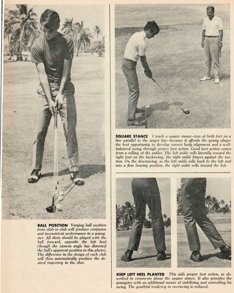 The photos accompanying this article show my son Dick illustrating the swing fundamentals I would stress in teaching all junior golfers. These are basically the key points I have concentrated on ever since starting to teach golf. The only change I’ve made in my teaching program over the years has been the emphasis I now place on the short game. I believe strongly in the value of practicing all possible shots required from 50 yards and on in – pitches over bunkers, chips from rough, lag putts, and all the rest. Even today I see pros on tour with beautiful swings who, after getting close to the green, can’t get the ball “up and down.” I’d recommend intense short-game practice to any youngster who wants not only to swing well, but also to score low.